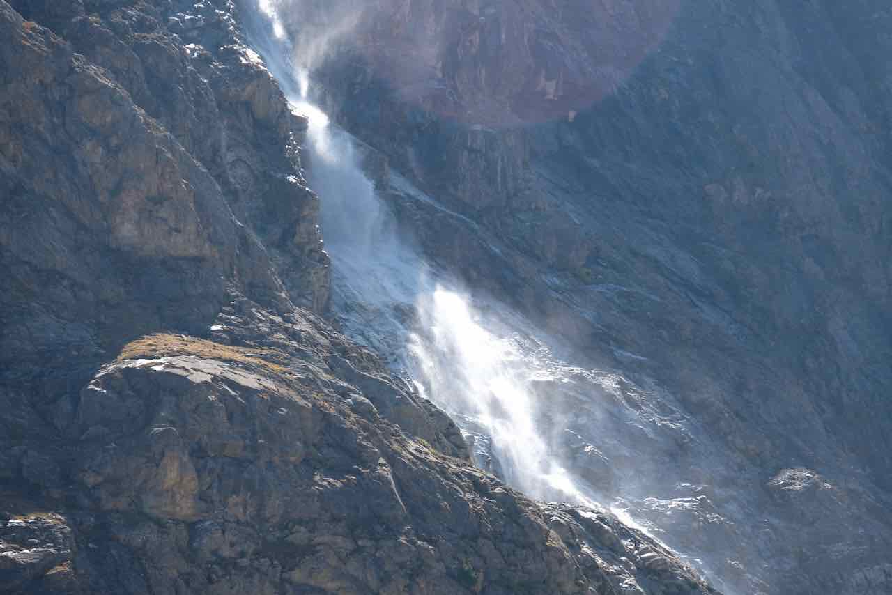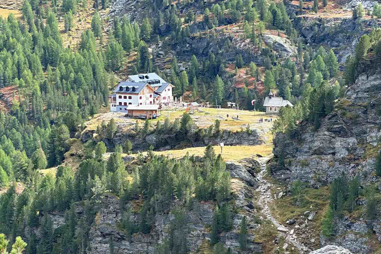 Zunächst liefen wir vom Parkplatz zu einem kleinen Teich, in dem sich die umliegenden Berge spiegelten, die wir morgen besteigen wollten. Durch die Bäume hindurch erblickten wir zum ersten mal das rote Hotel Paradiso, welches später noch öfter als Farbtupfer auf den Fotos vom Martelltal auftauchen würde. Gebaut wurde es 1933-1935 und erlebte seine Blütezeit bis zum Beginn des Zweiten Weltkrieges. Seit Kriegsende ist es verlassen. Nun waren wir gespannt auf die Plimaschlucht, einem der Highlights des Nationalparks Stilfser Joch. Die Erschließung der vorher für Besucher kaum zugänglichen Schlucht wurde 2017 abgeschlossen. Der Rundwanderweg beginnt an der „Kelle“, einer in die Tiefe ragenden Stahlkonstruktion. Diesen ersten von 4 Aussichtspunkten am Rande der Schlucht haben wir in der Eile verpasst. Wir stiegen direkt bis zur Sichel auf. Die Sichel ist eine halbrunde Plattform, die einen beeindruckenden Blick in die Schlucht gewährt. Danach folgt die Kanzel und eine Hängebrücke über die ganze Schlucht hinweg. Die Nachmittagssonne warf grelles Licht auf einen Teil der Schlucht, der andere Teil versank in tiefem Schatten. Schwierig fürs Fotografieren. Die Hängebrücke führt direkt zur Zufallhütte, aber das sollte erst morgen unser Ziel sein.