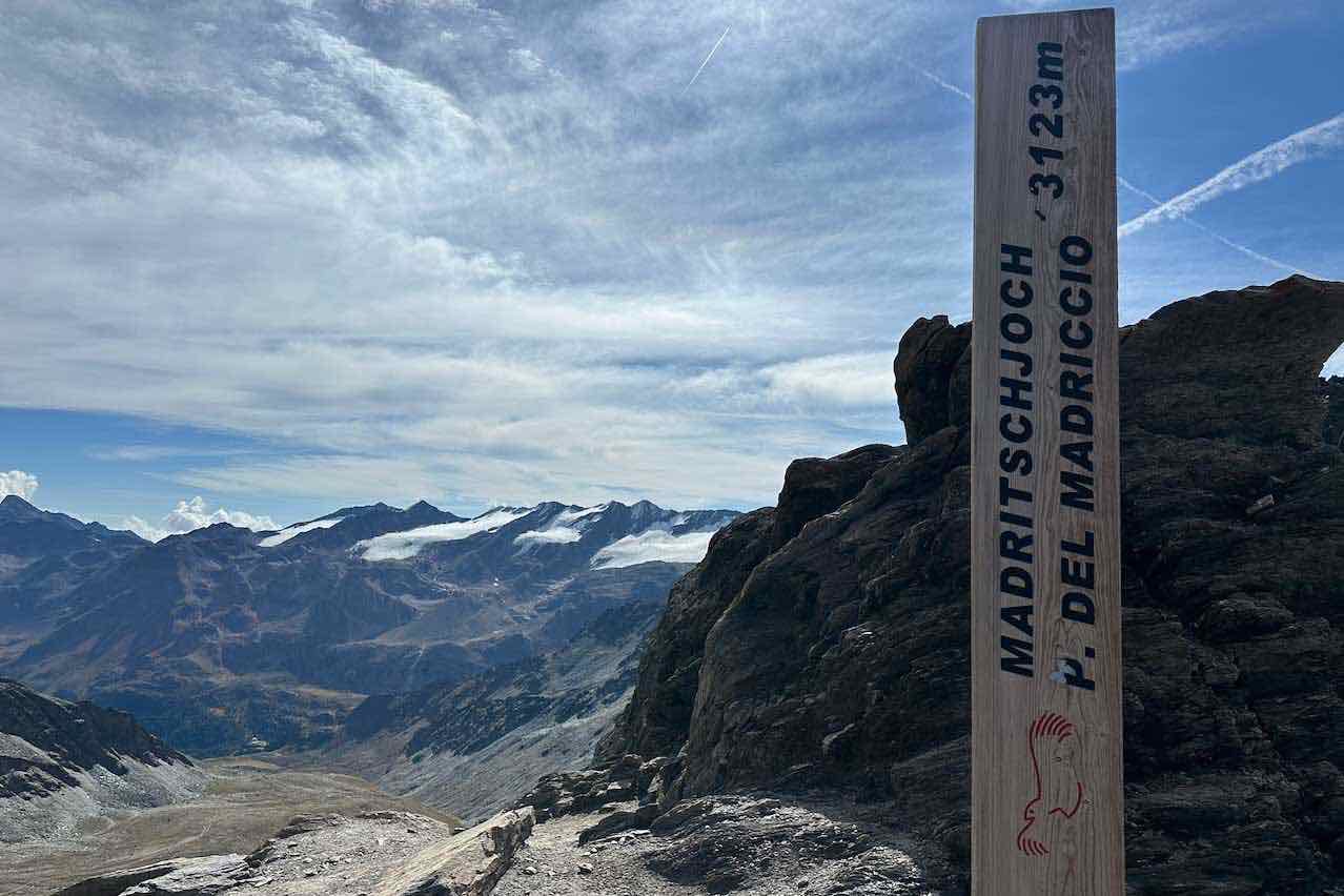 Der nächste Vormittag war für eine gemütliche Tour ins Pedertal und eventuell zur Lyfi Alm vorgesehen. Zum Abschied empfahl uns der Hüttenwirt für unseren nächsten Besuch eine Tour durch das Plimatal weiter aufwärts zur Madritschspitze (3.265 m). Und zwar wegen der atemberaubenden Aussicht auf den Ortler. Mit diesem Gedanken im Kopf erreichten wir den Abzweig des Weges Nummer 33 und entschieden uns kurzerhand, die 151 parallel zum Madritschbach bergan weiterzulaufen, um wenigstens das Madritschjoch (3.123 m) auf direktem Weg zu erreichen. Das Wetter war sonnig, wir waren ausgeruht und so erreichten wir schon bald das Joch. Der Ausblick, der sich einem auf den allerletzten Metern unerwartet auftut, ist tatsächlich atemberaubend. Greifbar vor uns lag die schneebedeckte Königspitze (3.851 m) und der Ortler (3.905 m). Bergab liefen wir die gleiche Strecke und kehrten zum Erstaunen des Wirts nochmal auf der Zufallhütte zum Essen ein. Zum Parkplatz hinunter liefen wir dann den normalen Fahrweg in einer halben Stunde.