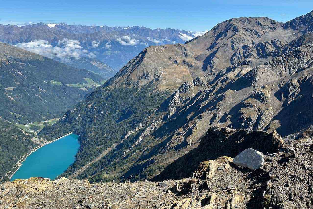Schon die Anfahrt durchs Tal war angenehm und führte uns an Blumenkohlfeldern vorbei durch Europas höchstgelegenes Erdbeeranbaugebiet. Durch die unterschiedlichen Höhenlagen von 900 bis 1.800 m ergibt sich eine unterschiedliche Reifezeit, so dass es eigentlich den ganzen Sommer über Erdbeeren im Martelltal gibt. Gegen Ende der Fahrt fuhren wir in 1.850 m Höhe am türkisblauen Zufrittsee vorbei. Er wird vom Fluss Plima durchflossen und dient der Energiegewinnung, obwohl sich das Kraftwerk viel weiter unten in Laas befindet. Das Kraftwerk und der Stausee wurden in den 50iger Jahren des vorigen Jahrhunderts errichtet.